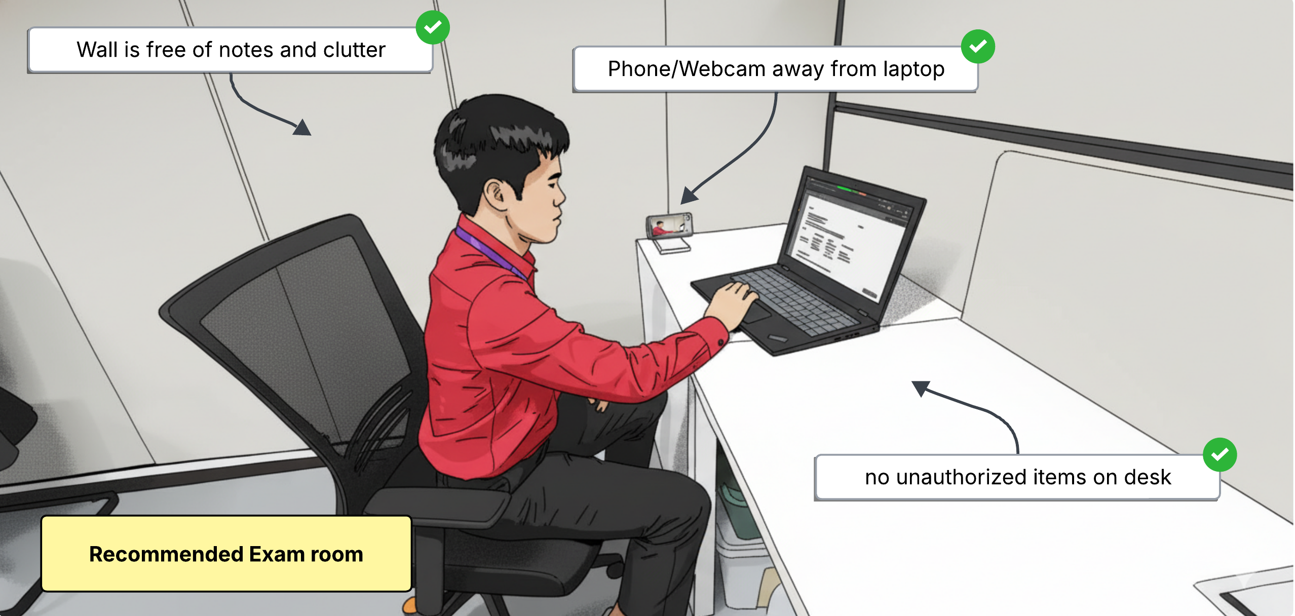 Online examinations require a controlled and well-prepared environment to ensure fairness, security, and smooth conduct of the test. This guide outlines the essential requirements for your exam setup, camera positioning, and conduct during the exam.